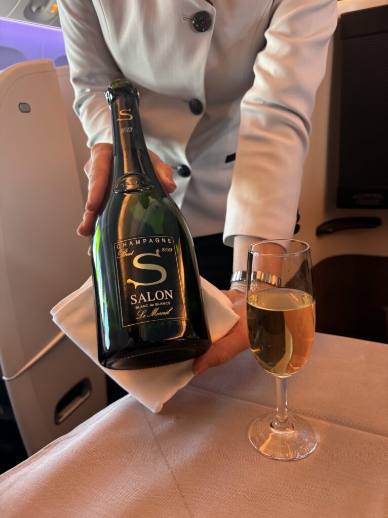 例えばこのシャンパンだが、サラリーマンの平均月収ぐらいする。これをJALのファーストクラスの機内で振舞われており、無料で飲むことができる。