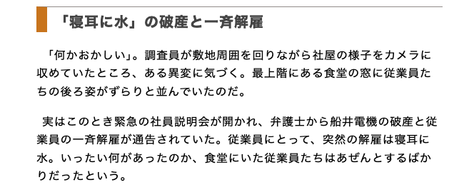 これは船井電機の倒産時の記事の抜粋だが、悲惨極まりない。